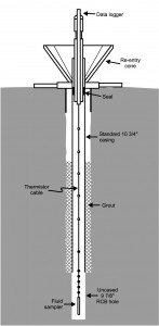 Away from their boundaries, Earth’s tectonic plates are known to move steadily at rates equal to those defined over geologic time scales, i.e. at centimeters per year, but near plate boundaries motions are episodic. Stresses accumulate for years to hundreds of years, and are then released suddenly through large amounts of slip. These events are usually accompanied by earthquakes, which can be damaging when they occur near centers of population. Wherever they occur, earthquakes affect the geologic environment by changing the hydrologic structure of the surrounding crustal rock directly (e.g. fracturing creates new pathways for fluid flow), and indirectly (e.g. squeezing the crust creates pressure gradients which drive fluid flow, and intensive shaking can result in enhanced pressure of pore fluids). These strain induced pressure changes can be observed for hundreds of kilometers from sites of slip. Observations of tectonic activity at the Cascadia subduction zone can be made using Circulation Obviation Retrofit Kit (CORK) instruments. CORKs are installed at boreholes drilled several hundred meters into the ocean crust in order to monitor pressures below the seafloor. The measured amount of pressure change at the borehole site can be used to determine the magnitude of slip and thus the efficiency with which earthquakes are generated…